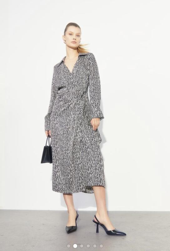 Сукня довжиною до литок з м’якого драпірованого атласу з коміром, V-подібним вирізом і довгими рукавами з широкими манжетами на ґудзиках і розрізом. Обгортка спереду з широкими зав’язками з одного боку та прихованими вузькими зав’язками з іншого боку. Без підкладки. В наявності чорно біла, фото в інших кольорах для прикладу. Розмір вказано S. З останніх колекцій. Колір молочний/чорний. Нова, без бірки, торгу немає ! Склад: 100% віскоза. Заміри: Довжина по спинці ( ззаді по центру від горловини ) 113 см; Довжина по боковому шву 93-94 см; Пог 47 см; Пот 37-38 см, завязками регулюється на менший обєм; Рукав від плеча 60-61 см.