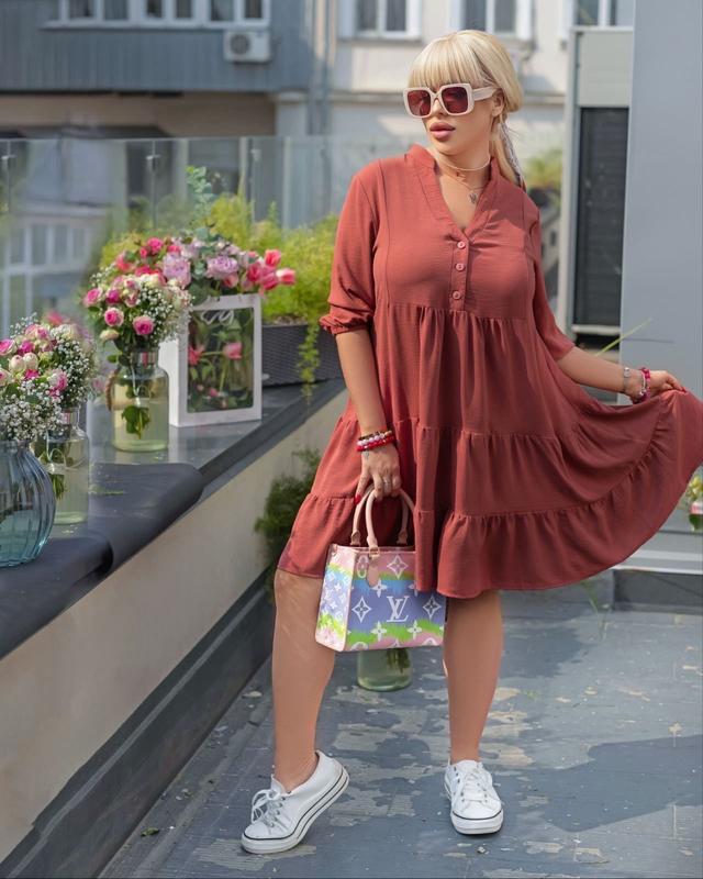 153 МОДЕЛЬ🆕 СУКНЯ ВІЛЬНОГО КРОЮ •Оборки, прилегла стійка, планка до лінії талії, застібка на гудзиках. •Рукав 3/4 довжина, низ рукавов на резинці!! ▪РОЗМІРИ: (46-48);(50-52);(54-56) ▪ТКАНИНА: креп жатка ▪КОЛЬОРА: бузковий, м’ята, синій, темний корал ▪ЦІНА: 630 грн