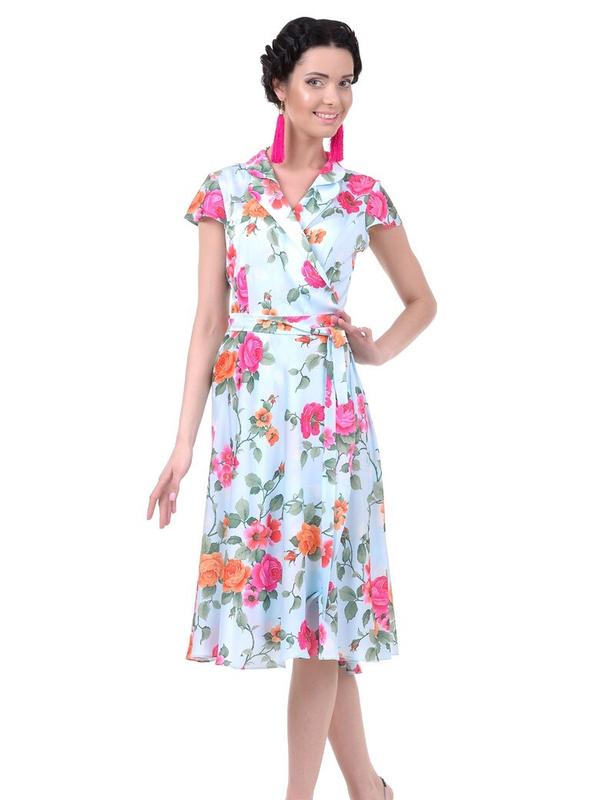 Платье Гизем Состав: вискоза-40%, 10%-шелк, Размер: 44; 46; 48; 50, 52 Летнее платье в романтическом стиле. Платье отрезное по талии, расширенное к низу. Верхняя часть платья прилегающего силуэта, с рельефными швами нижняя - покроя полу солнце-клеш. Застежка смещенная, платье с запахом. Понизу платья край запаха закругленный. Воротник отложной с лацканами. Платье без карманов. Платье без пуговиц, держится на завязывающемся поясе. Рукава короткие, до половины проймы.