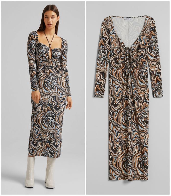Стильное платье BERSHKA в интересный принт. Классно садится, достаточно эластична и комфортна. Материал средней плотности. Размер С, я на фото 88-65-93, рост 170