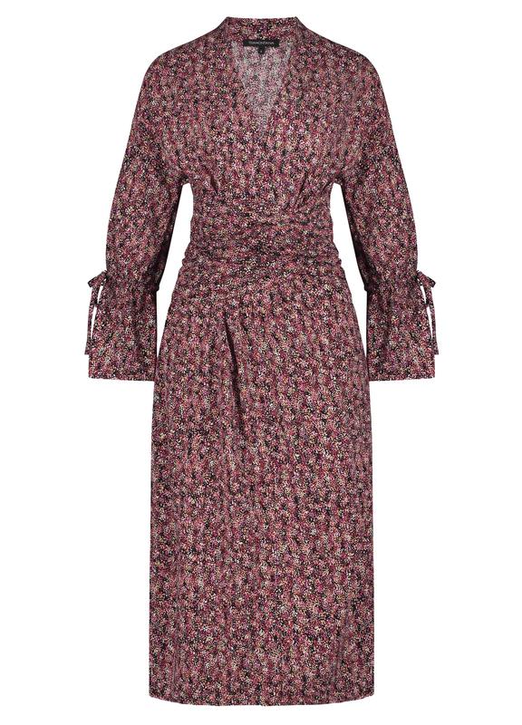 размер 36 (с-м) Это платье миди с V-образным вырезом можно носить по-разному. Расклешенный рукав пагоды можно мгновенно превратить в рукав трубы, потянув за шнур наполовину вниз по предплечью. По бокам талии притавляется широкая полоса ткани, которую можно завязать или завернуть по-разному. В ткань из вискозы вплетено золотую люрексовую нить, которая создает мелкое мерцание и придает ткани еще более роскошный вид.