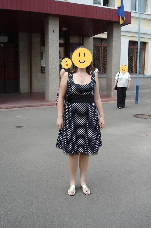 Чёрное платье в белый горошек бренда OGGI Ultra в розмере 170-96. Пояс снимается, застёгивается на крючки и кнопку. Есть два кармана. Подкладка с сеточкой по краю. Сбоку есть молния. также на спине есть пуговицы, которые расстёгиваются, но для надевания вполне хватает молнии. Полуобхват талии 40 см.