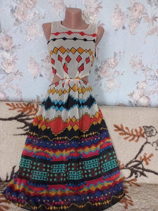 Очень интересное и красивое платье. Принт невероятно красивый. Длина 114см, плечи 29см пог 45