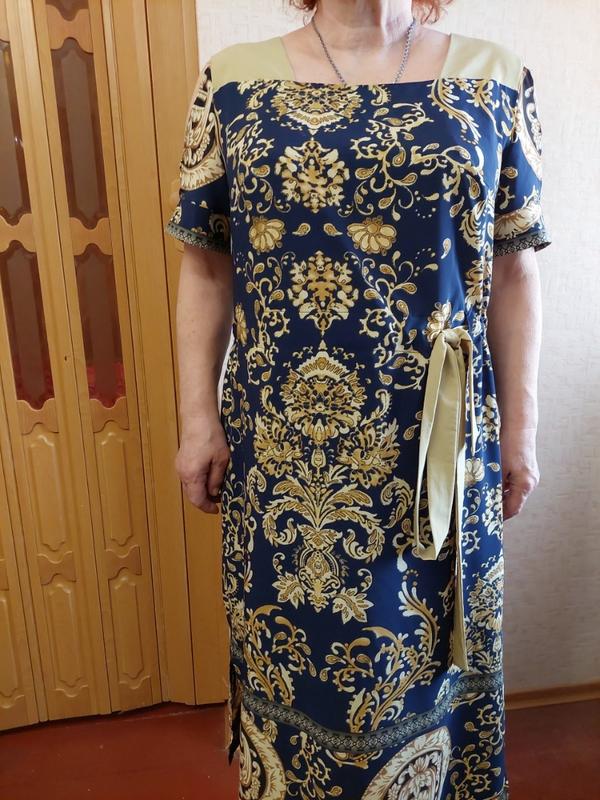 Длина 120см. Н/о груди 58 см, талия 57, бедра 63. На талии вшит пояс, внизу разрезы с обеих сторон, на рукавах вырезы.