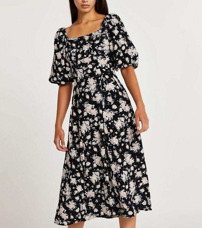 Сукня від River Island з квадратним вирізом та об'ємними рукавами нова з етикетками довжина міді. по плечах та рукавах на резинці розмір uk8 S/XS Заміри довжина 120см. ПОГ 39см. тянется +3-4см. під грудьми по шву в півохвата 35см.-тянгнеться до 37-38см. довжина рукава 34см. (довжина 3/4) склад 100% віскоза