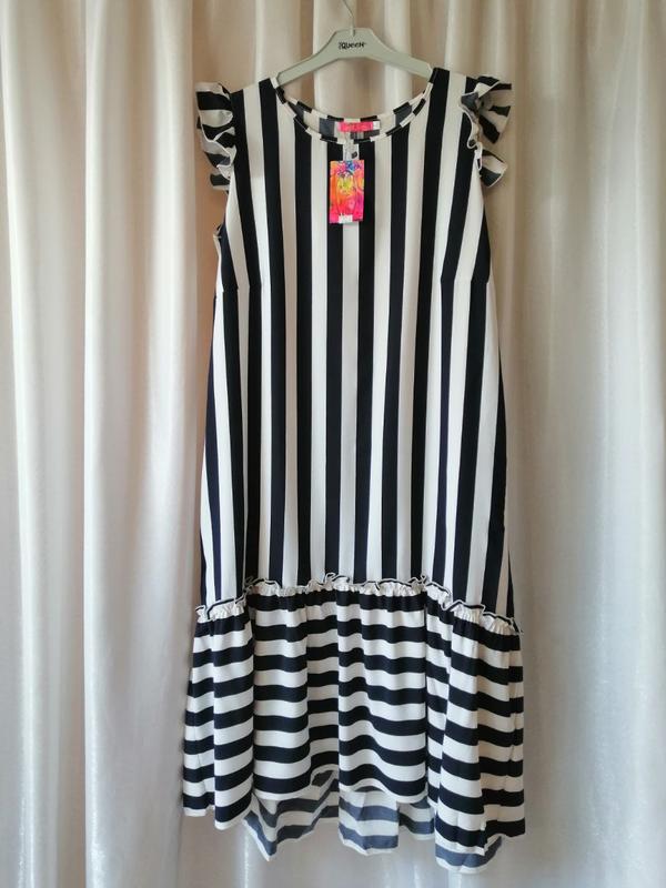 Сукня розлітання в смужку довжини міді з воланом по низу і рюшами на плечах дві бічні вріз...
