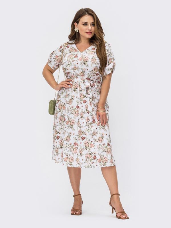 на прогулянку Платье в цветочный принт с коротким рукавом и V-образным вырезом горловины. Модель отрезная по талии с юбкой-трапецией. В боковых швах карманы. Комплектуется поясом. Размер :52,54,56 длина изделия – 112 см. длина рукава (от плечевого шва) – 27 см Состав: 50% вискоза, 50% полиэстер Материал: софт Сезон: лето Цвет: белый Фасон: платье-клеш Детали: отрезное по талии арт162260