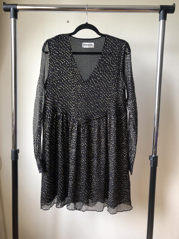 Черное с золотым, свободного кроя платье миди премиального бельгийского бренда. Стан - идеальный новой вещи. Размер S - M. Замеры: ширина по груди - 47 см, ширина по талии - 50 см, длина рукава от шеи - 74 см, длина изделия по спине - 84 см. Состав: верхняя ткань - 100% шелк; нижняя ткань - 100% полиэстер. Рекомендуемый уход: ручная стирка и глажка при низкой температуре.