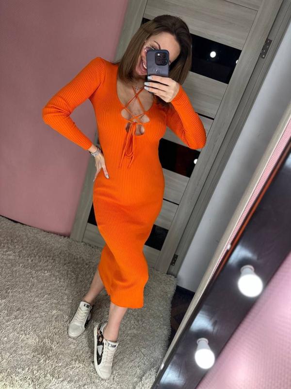Платье рубчик Производство Турция Хорошее качество, садится классно. Одна сторона платья со шнуровкой, можно одевать на обе стороны. Воротник единственный Цвет: сочный апельсин