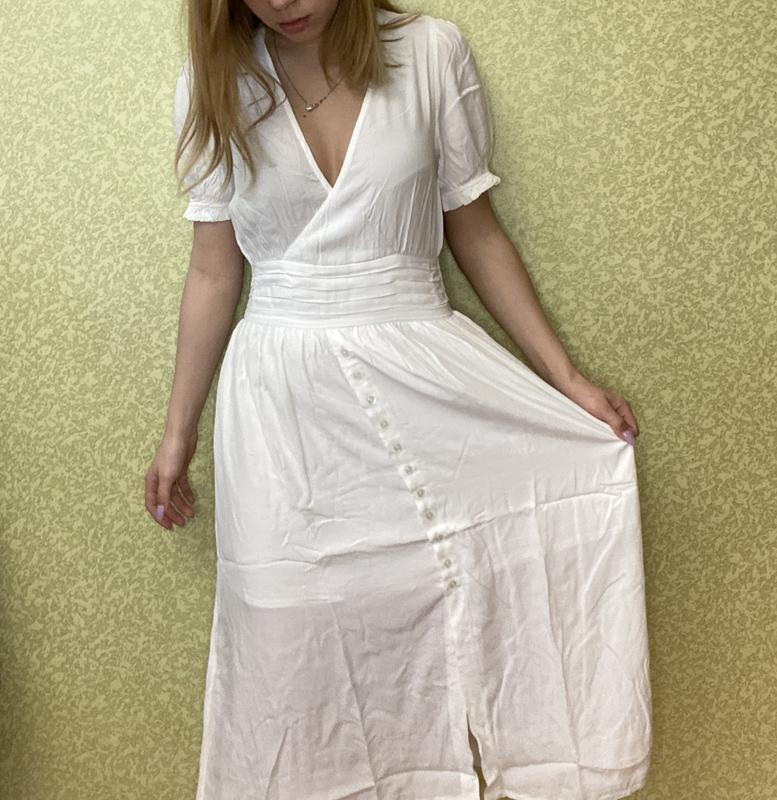 Платье длина миди с V образным вырезом Размер S, но вполне подойдет на маленькую М Цвет: белый Ткань легкая, но не светит Очень круто подойдет на лето, или теплую весну