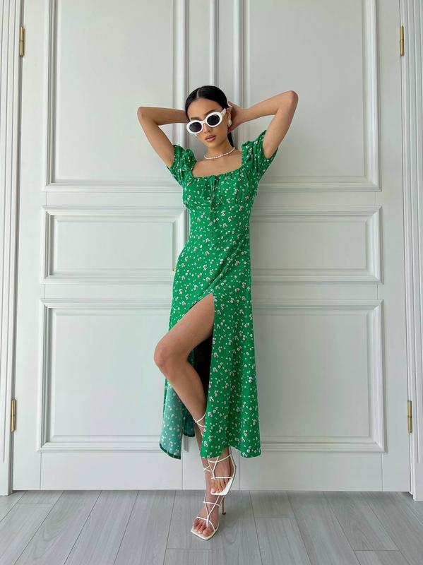 Платье шпатель миди цветочный принт бохо грудь на кулиске с разрезом на ноге красивое дек...