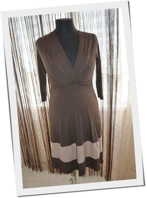 Вискозное платье, 46-50 размеры. одето на манекен 52 размера. Силуэтное платье, красиво очеркивающее грудь - V-образный вырез + прищепы-складочки на талии, расклешенная юбка формирует фигуру песочные часы. бирки с составом нет - по ощущениям - вискоза. Цвет - шоколад + вставка внизу - белый шоколад, делает платье веселее. №5а. Замеры: ПОГ 39-52см, ПОТ 28-45см, ПОБ 50-64см, плечи 34см, рукав 47см, длина изделия 91см.