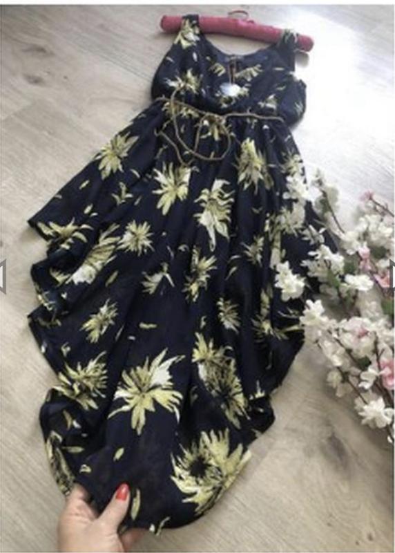 Стильное и очень красивое асимметричное платье. Размер указан UK 12 (L) Подойдет на S-M-L Цвет синий с очень красивым салатовым принтом - цветы. Ткань - шифон на подкладке. Асимметричное платье - с длинными углами. В комплекте кожаные поясок ( экокожа) платье смотрится очень легко и стильно.