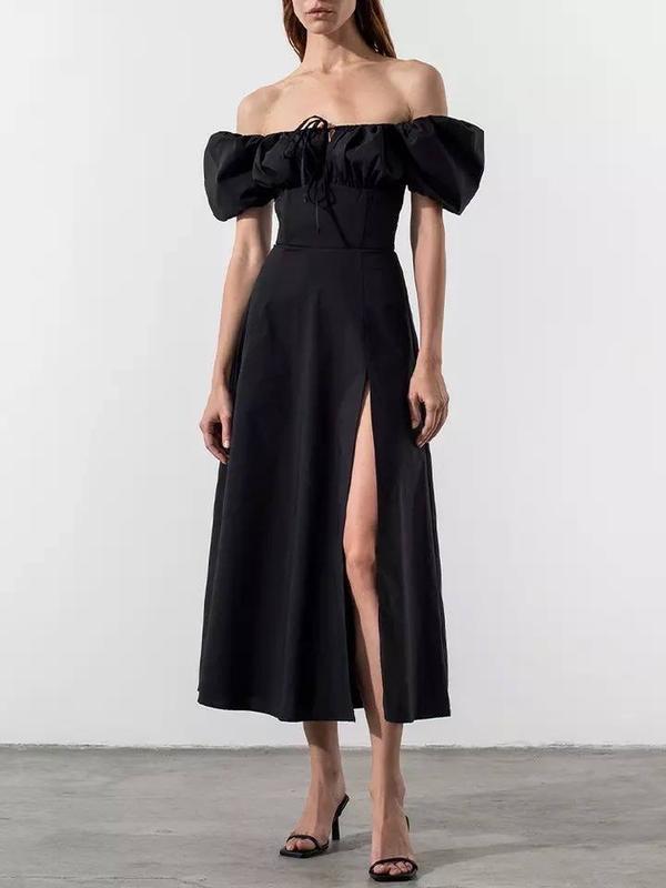Платье миди черное белое с разрезом с пышной юбкой с открытыми плечами с корсетным лифом...