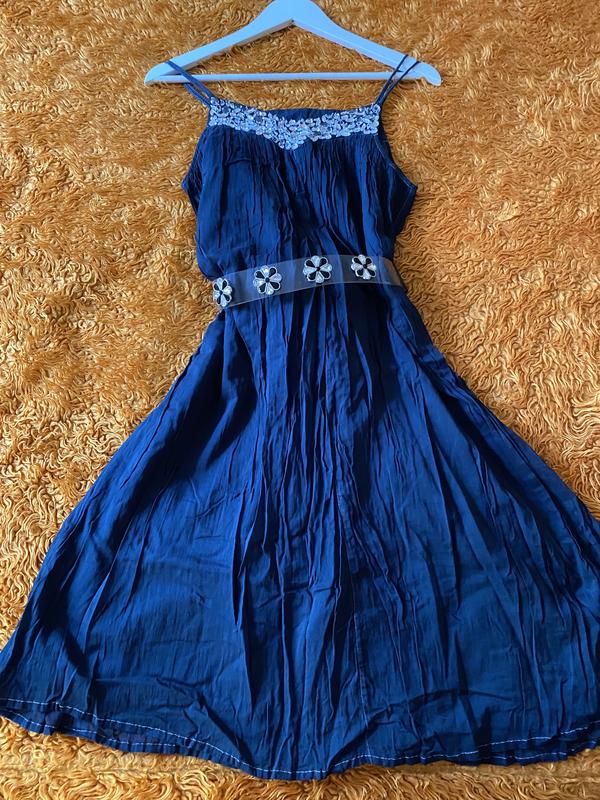 Сукня, 100% бавовна, з підкладкою. Повсякденна, вечірня. Середньої довжини. На тонких бретельках, з вишивкою штучного скла-каміння. Заміри: НОГ (під пахвами) - 46, далі йде вільна трапеція, вільний сарафан - 76 - 99 (внизу), бретельки - 10, довжина (з берельками) - 100. Х/б, на тонкій х/б підкладці. Найкраще пасує носити з поясом)