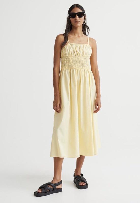 Нова легенька натуральна сукня у ніжно лимонному відтінку H&M 💛💛💛 Довжини міді, 💯 хрусткий приємний котон гарноі щільності, не просвічує🙌🏻 Розмір С. Можна ХС Довжина 125 від плеча ПоГ 37-52( резинка) ПоТ 35-50( резинка) Бедра- вільно Верхня частина на резинках, і дуже добре тягнеться,