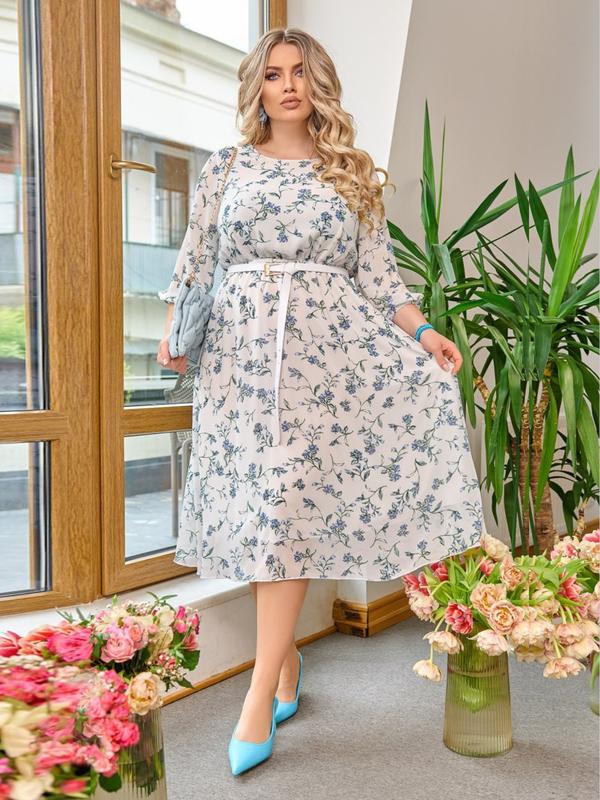 Принтована сукня з шифону. Виріб із круглим вирізом горловини. Рукави ¾ з манжетою на резинці. Відрізана по талії. Текстильний пояс у комплекті. Розмір:46-48,50-52, 54-56, 58-60, 62-64, 66-68 довжина по поличці – 120 см довжина рукава (від плечового шва) – 47 см. Склад: 100% поліестер Склад підкладки: 50% віскоза, 50% поліестер Колір: білий,бежевий, темно-синій Матеріал: Шифон арт90538