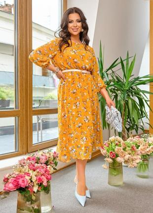 Принтованное платье из шифона. Изделие с круглым вырезом горловины. Рукава 3⁄4 с манжетой на резинке. Отрезанная по талии. Текстильный пояс в комплекте. Размер:46-48,50-52, 54-56, 58-60, 62-64, 66-68 длина по полочке – 120 см длина рукава (от плечевого шва) – 47 см. Состав: 100% полиэстер Состав подкладки: 50% вискоза, 50% полиэстер Цвет: белый, бежевый, темно-синий,черный, желтый, зеленый Материал: Шифон арт90538