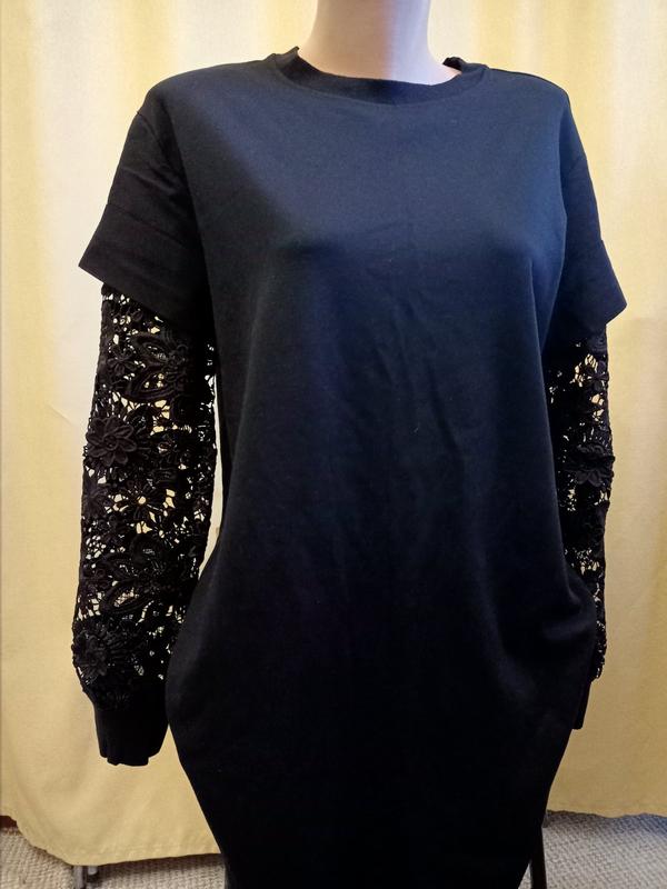 Замеры: ПОГ - 55 см, Д изделия - 87 см. Оригинальное платье - туника прямого кроя. Ажурный рукав из добротного кружева.