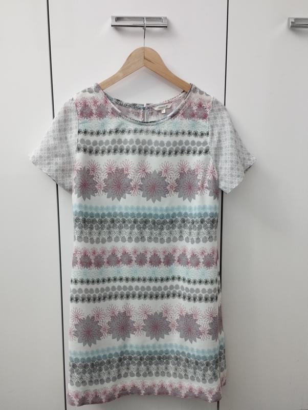 Сукня віскоза, тканина не тягнеться, гарний принт, ззаду на горловині застібається на гудзик. Орієнтуйтесь на заміри. Плечі 35 ПГ 46 ПТ 45 ПБ 48 Рукав 20 Довжина 82