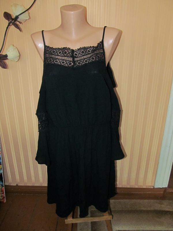 Новое Прикольное платьице с оголенными плечиками и рукавчиками волан. Очень красивые кружевные вставки. Р 12 пог-51, пот-36/50, длина- с бретэлями 92 (брет.регулируются, длина по боковому шву от подмышки-62. . В составе 100% вискоза
