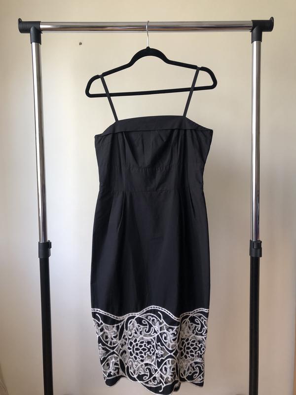 Черного цвета платье-футляр длины миди с низом выполненным в технике «Решелье» люксового польского бренда. Состояние очень хорошее, без дефектов. Размер S - M. Замеры: ширина по груди - 40 см; ширина по талии - 38 см; ширина по бедрах - 48 см; длина изделия по спине - 86 см. Состав: верхняя ткань - 100% хлопок; нижняя ткань - ацетатный шелк. Рекомендований догляд: суха чистка.