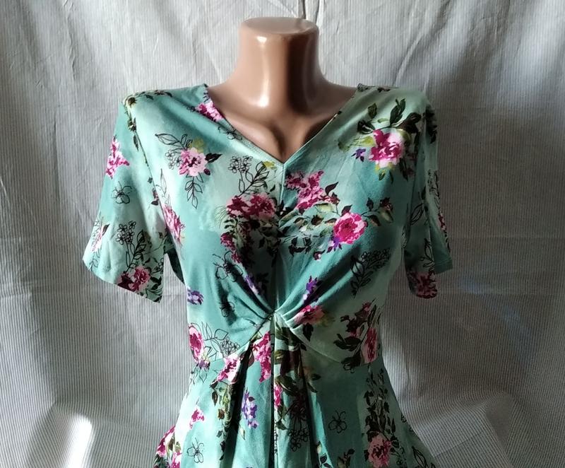 Натуральна,сучасна.В центрі-вузол. Гарний трояндовий принт. Завищена талія. Розкльошене. Схоже,що довжина зменьшувалась(сукня не вживана) - акуратно. В ціні враховано. ФОТО НА ТІЛІ НЕМАЄ. Довжина 93 Завширш(пахви) 46/53