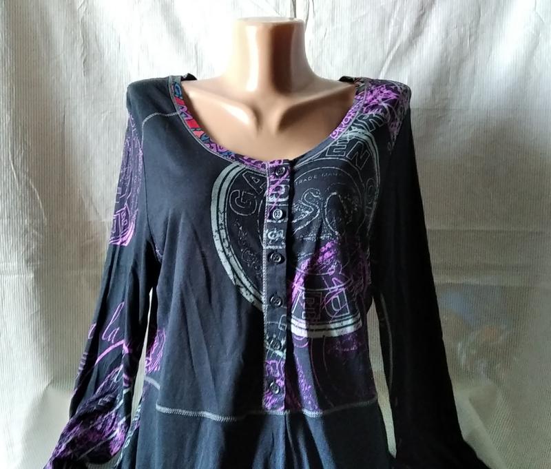 Натуральна,сучасна. З асиметричним низом. Має гарний цікавий принт. Розкльошена. ФОТО НА ТІЛІ НЕМАЄ. Довжина 88 Завширш(пахви) 51/56 НОТ 50 Річ нова,без паперової бірки -СТОК.