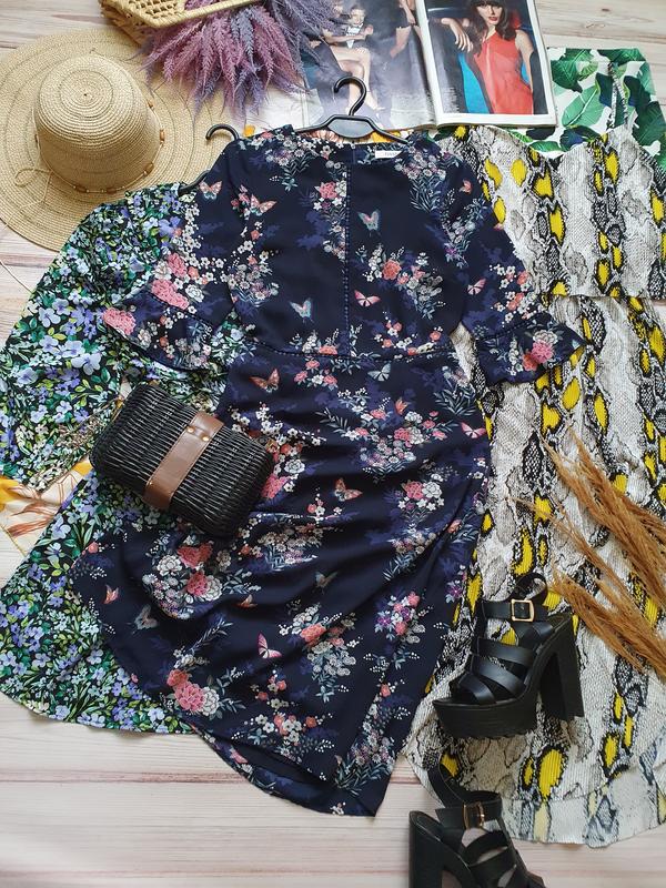 ШИФОНОВА КВІТКОВА МІДІ СУКНЯ. Довжина 105см Плечі 36см Рукав 39см Об'єм в грудях 86см В талії 70см В бедрах 98см. Тканина не тягнеться.