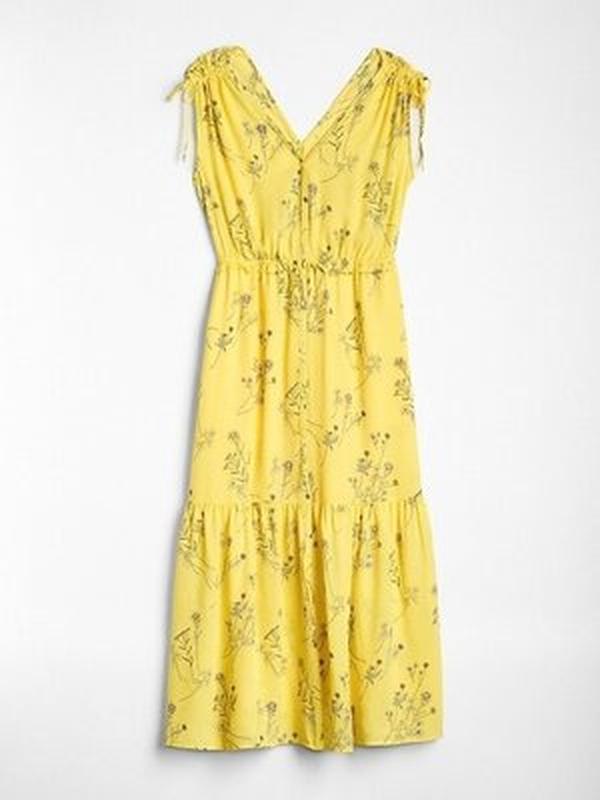 Многоуровневое платье-миди с v-образным вырезом в цветочный принт от Gap подклад срезанный, очень уже был плотный а так состояние идеально Размер указан S, но отлично подойдет и на М 100% полиэстер Не светится Плечи можно стянуть Боковые карманы Попереду на гудзиках яркое как и на рекламном фото Замеры дл от плеча 125 дл по боку шва 101 дл спереди от выреза по пуговицам 104 дл от плеча до талии 38 ПОГ 49 ПОТ 32 резинка, тянется к ПОТ 49