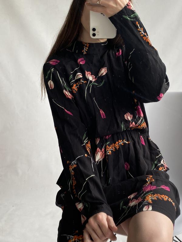 Красивое платье в цветочный принт с оборкой на талии Размер L Длина 90 Грудь 53 Рукав Талия 37,тянется 55 Бедра 55 Без дефектов,ткань вискоза