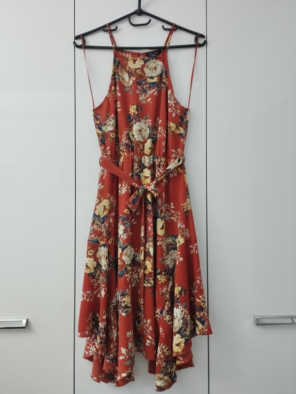 Гарна сукня, теракотового віддінку, по низу астметричний крій, талія на резинці, яка гарно тягнеться, ззаду застібається на гудзик зверху, є пояс. Орієнтуйтесь на заміри. ПГ 47-49 ПТ 33 резинка, тягнеться до 48 ПБ вільно до 60 Довжина 100/112
