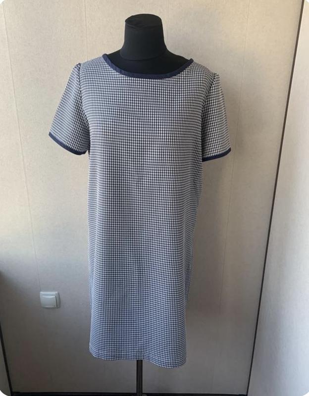 Ровное платье в клетку, украшенное синим кантом,бирки срезанные смотри замеры Цена 280 грн ОГ 108 см ОТ 108 см ОС 112 см Длина 92 см Длина рукава 23 см Ширина рукава 36 см Плече 42 см