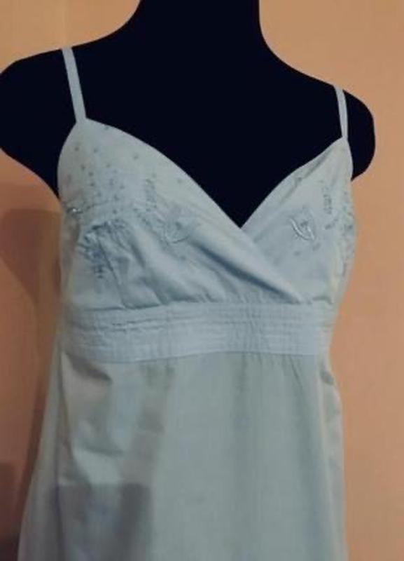 Нежно голубой Хлопковый сарафан с вышивкой бисером . Размер указан 12 . Состояние нового . Длина по спинке 78 см, от плеча 100 см, ПОГ 50 см, пот 49 см, ПОБ 56 см Состав: Котон