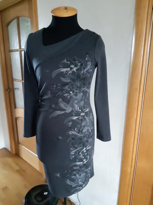 Трикотажное платье серого цвета с цветочным принтом. Горловина ассиметрична. На талии драпировка. Хорошо садится по фигуре. На спинке молния и разрез небольшой на юбке. Рукава длинные втачные.