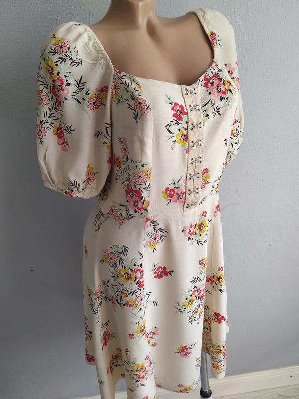 Сукня з квадратним вирізом зі 100% віскози, від талії спідниця трохи розкльошена, рукави на гумці, спереду декоративна застібка-обманка на металевих гачках, спинка повністю на дрібних гумках (див. останнє фото), розмір європейський 38, стан нової речі, виміри: довжина - 68 см, ПОГ - 46-47 см, ПОТ - 38 см, ПОБ - 55 см, довжина рукава - 32 см. ПОВЕРНЕННЯ ТА ОБМІНУ ТОВАРУ НЕМАЄ!