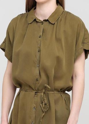 Платье из гладкого материала, расклешенное от линии талии. Модель с отложным воротником рубашечного типа, застежкой на пуговицы спереди и коротким рукавом с подкатом. На талии — узкий пояс. Закругленный низ изделия и разрезы по бокам. Замеры на фото. Бренд H&M Состав 100% лиоцелл