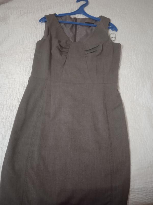 Классический офисный сарафан на подкладке с драпировкой по декольте, коричневый меланж.