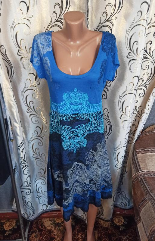Жіноча літня сукня з цікавим принтом Desigual Розмір UK 12/14 EUR 40/42 Заміри: - напівобхват грудей 46-53 см, - напівобхват талії 44-50 см, - напівобхват стегон 50-60 см, - довжина 105 см. Бірка зі складом зрізана У стані нової речі