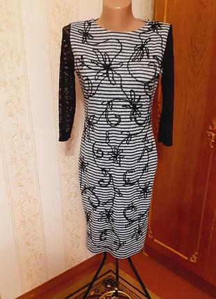 Нарядное миди платье с вышивкой блесток паеток!рукава ажурный гипюр по составу трикотаж с шерстью отличное качество приятное к телу!Дл.90 Пл.36 Р 3/4-40 Б по 15 Ог 90 От 80 Об 96