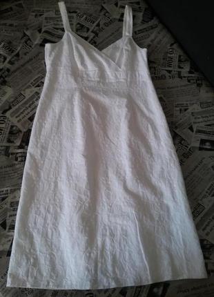 Очень красивый белый сарафан с машинной вышивкой. Всегда модный и актуальный на лето. Сарафан имеет подкладку, застегивается сбоку на молнию. Размер на бирке 14. Замеры: пог 44 см, пот 43 см, поб до 57 см, длина с учётом брителей 105 см.