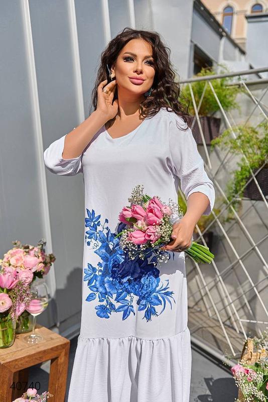 Платье с принтом. ПАРАМЕТРИ МОДЕЛІ НА ФОТО: 100-78-102 см РОЗМІР МОДЕЛІ НА ФОТО:48 РИСТ МОДЕЛИ НА ФОТО:170 Ориентировочные замеры по готовому изделию: 48-52, 54-58 Обхват грудей-116/124см. Обхват талии-111/119см. Обхват стегон-125/133 см. Длина рукава-24 см. Длина изделия-123 см