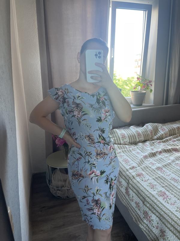 Платье цветочное, очень приятная ткань, смесь коттона и муслина, ложится по фигуре, плечики с рюшами