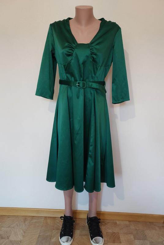 Яркое изумрудное платье с поясом 46-48 размера. По длине 102 см, обхват груди 100, талия 85, бедра 120, длина сверху до пояса 40 см, плечи 42, рукав от плеча 42, сзади вшит скрытый замок 53 см. Ткань плотная и переливается как атлас, пояс твердый