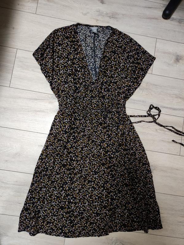 Идеальное платье на запах из натуральной вискозы в красивый мелкий цветочек, пояс резинка и пришитый поясок, плечи спущен, указанный размер S, но будет от М до L стан нового пояс в спокойном состоянии 35 тянется до 45 длина 98/99