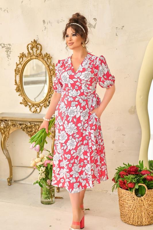 Принтована сукня на запах. Короткі рукави з манжетами на резинці. Зав'язується на вшитий пояс. розмір:46-48,50-52, 54-56, 58-60, 62-64, 66-68 довжина виробу – 125 см. довжина рукава (від плечового шва) – 30 см. Склад: 100% поліестер Колір: бузковий,темно-синій, рожевий, блакитний, червоний, чорний Матеріал: Креп арт90593