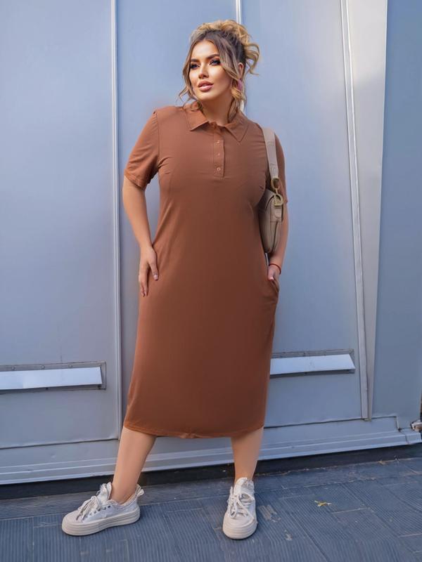 Трикотажное платье с притачкой по талии. Изделие с отложным воротником и короткими рукавами. Дополнена разрезом сзади и карманами. Застегивается на пуговицы по полочке. размер: 46-48,50-52, 54-56, 58-60, 62-64 длина изделия – 114 см длина рукава – 25 см Цвет: бежевый, синий, красный, коричневый Материал: Трикотаж Длина: меди арт98307