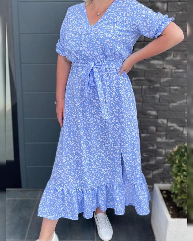 Очень красивое платье с V-вырезом, коротким рукавом на резинке, талия на резинке, внизу разрез. Пояс непришивной. Платье декорировано пуговицами (пуговицы нерабочие). Ткань: софт, не просвечивается Цвета: белый, мятный, голубой Размеры 48-50, 52-54, 56-58 (Замеры на последнем фото)