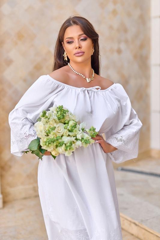 Матеріал-бавовна-жатка з вишивкою, підкладка штапель (натуральні тканини), талія на гумці, довжина від талії 75 см, верх на резиночці, можна моделювати виріб-приспущені плечі або закриті. 48-54 - на ОГ 96-110, ПРО до 130 56-62 - на ОГ 112-126, ПРО до 150 Розміри 48-54, 56-62 аш