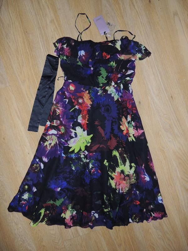 новое фирменное платье с биркой плотная атласная подкладка, сверху 2 слоя легкого шифона шифона, не просвечивается сбоку вшитый замочек, бретели регулируются есть накладной атласный черный поясок) на бирке указан размер 8 длина с бретелями 112см ПОГ 40см пояс 34-37см(резинка) без торгу